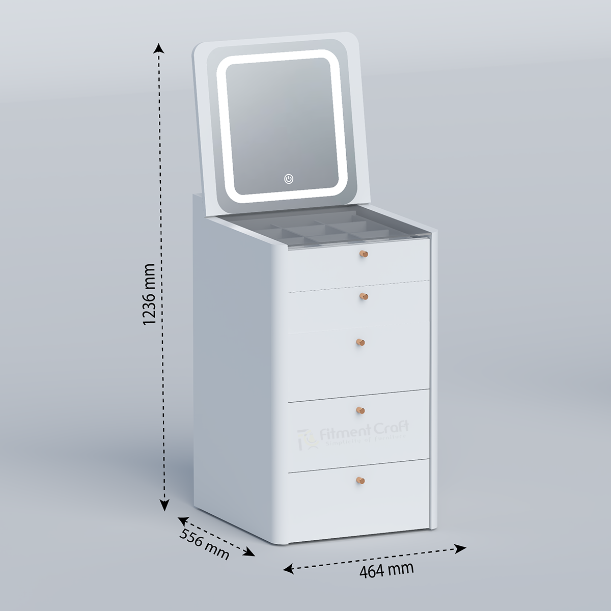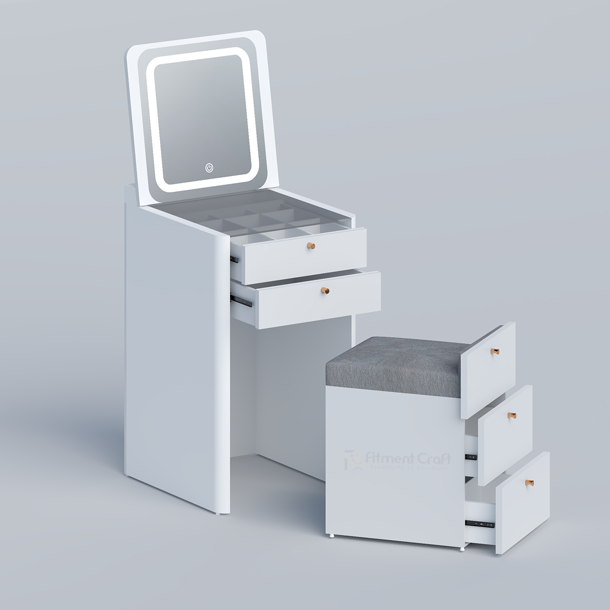 This modern Dressing Table with Sensor Light Mirror is designed to bring elegance and functionality into your bedroom. Its clean lines, soft finish, and smart storage make it ideal for contemporary homes. Crafted from 16 mm Laminated Board (LB) with a premium vinyl finish and a 5 mm mirror with touch sensor lighting, this unit blends durability with luxury — offering both style and everyday practicality.